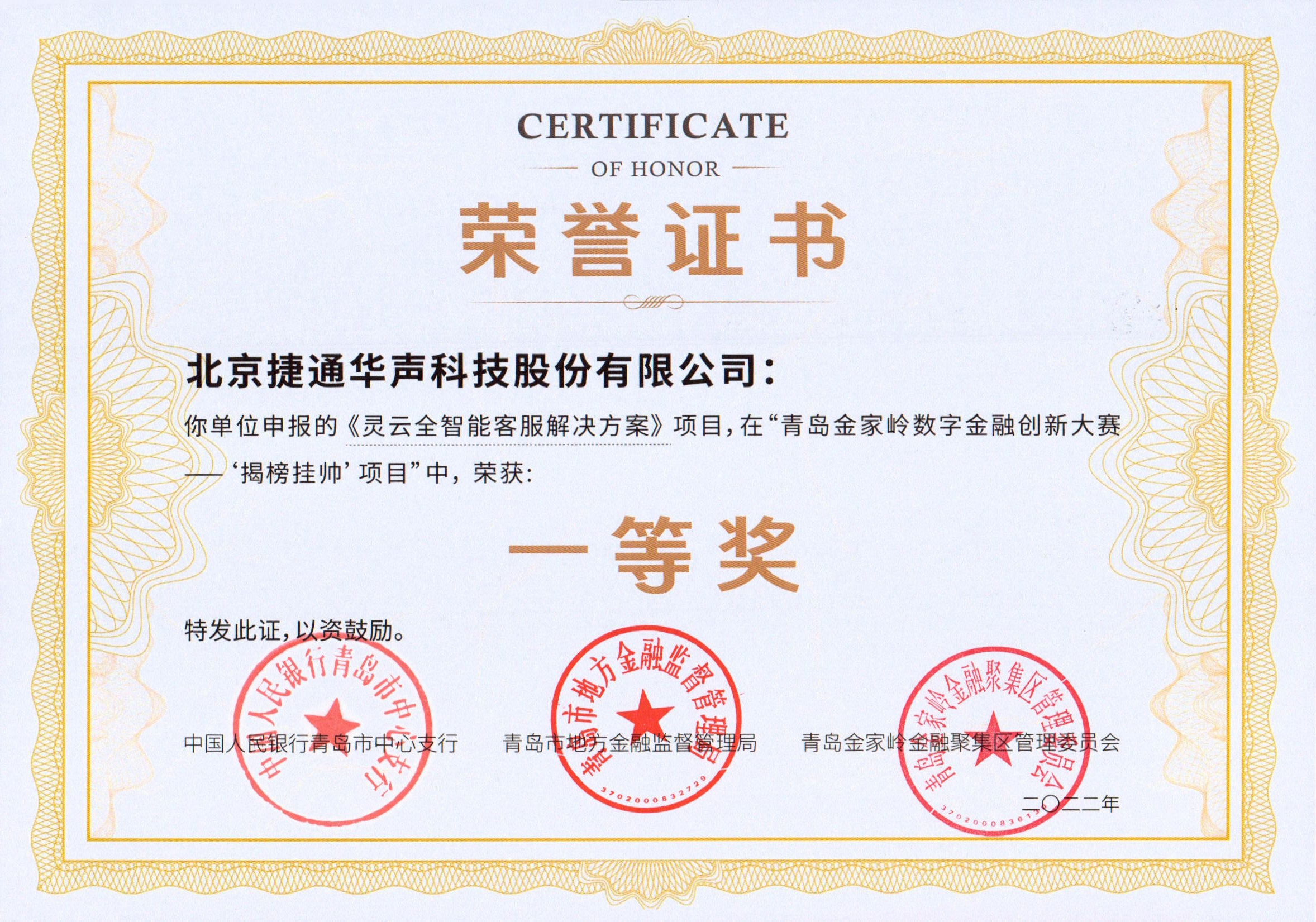 1月12日上午,由中國人民銀行青島市中心支行、青島市地方金融監(jiān)督管理局、青島金家?guī)X金融聚集區(qū)管理委員會主辦的青島金家?guī)X數(shù)字金融創(chuàng)新大賽頒獎儀式在全球(青島)創(chuàng)投風(fēng)投中心大廈成功舉辦。捷通華聲提報的“靈云AICC全智能客服解決方案”獲評"揭榜掛帥"項目賽道一等獎。