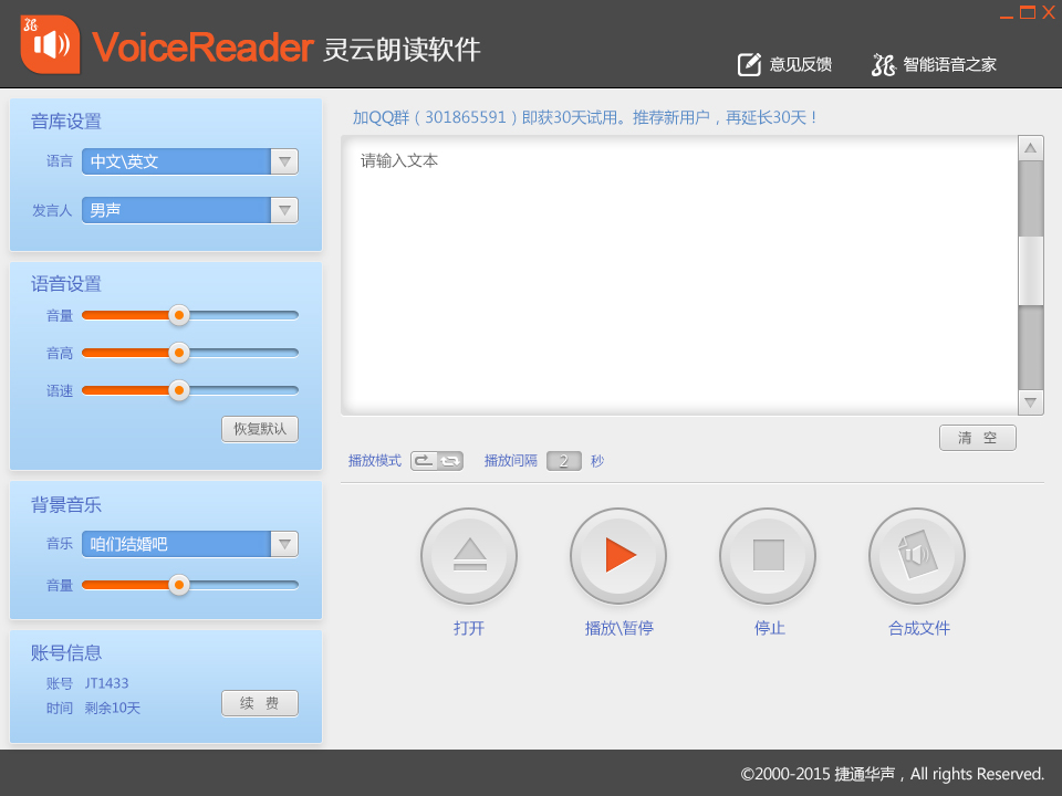 近日,捷通華聲公司于靈云平臺(hcicloud.com)正式發(fā)布VoiceReader6.0版,新版VoiceReader靈云朗讀軟件新增了自定義背景音樂功能和語音合成導(dǎo)出功能,滿足了目前廣大用戶最迫切的兩個需求,添加了微信支付功能,使續(xù)費更方便。同時,新版VoiceReader對交互界面進行了全面的改版和優(yōu)化,大幅提高了界面的美觀度與實用性。