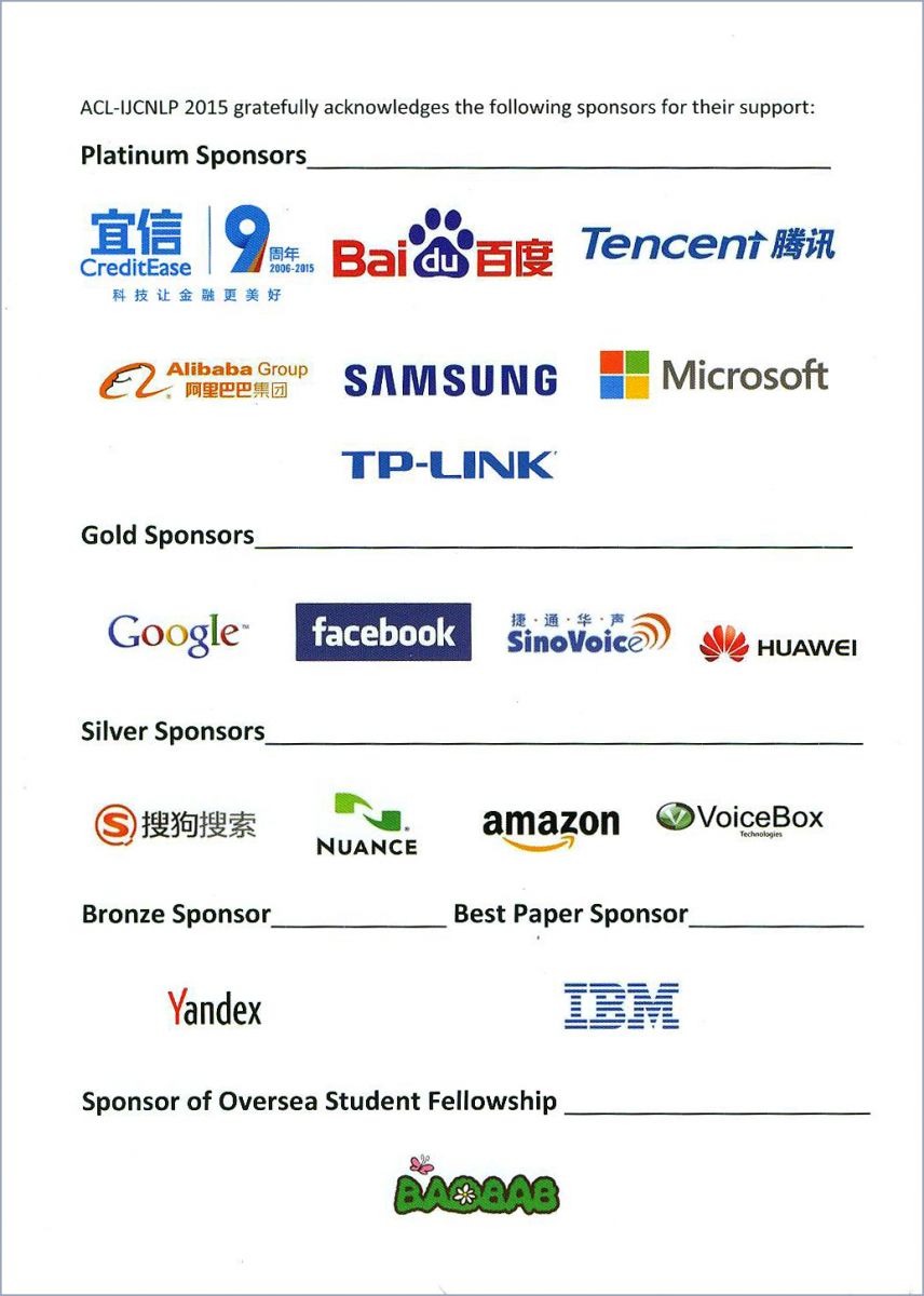 靈云科技訊:7月26日,國際語言處理領(lǐng)域最具影響力的“ACL-IJCNLP2015”年會(huì)于北京國家會(huì)議中心舉辦,捷通華聲與Google、Facebook、華為公司一起作為會(huì)議黃金贊助商贊助了此次國際盛會(huì)。捷通華聲同時(shí)在年會(huì)中全面展示了靈云平臺(tái)及靈云自然語言理解、數(shù)據(jù)挖掘以及靈云機(jī)器人等領(lǐng)域取得最新成果與應(yīng)用。