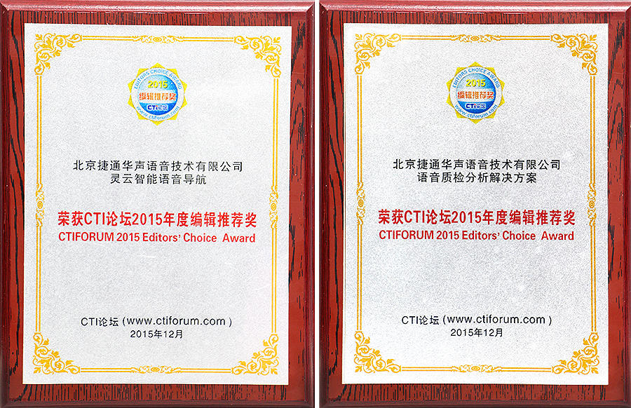 靈云科技22日消息:由CTI論壇主辦的2015年度“編輯推薦獎(jiǎng)”頒獎(jiǎng)典禮成功舉辦,憑借優(yōu)質(zhì)的智能語(yǔ)音交互及大數(shù)據(jù)平臺(tái),捷通華聲“靈云智能語(yǔ)音導(dǎo)航”及“靈云語(yǔ)音質(zhì)檢分析解決方案”喜獲CTI論壇2015年度編輯推薦獎(jiǎng)。