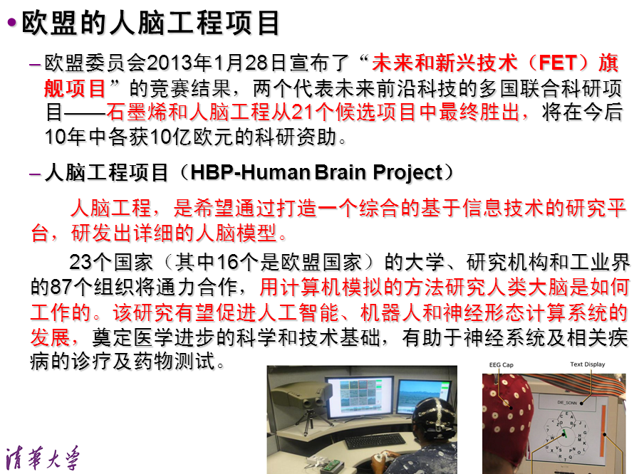 下面介紹一下關(guān)于腦電識(shí)別和腦機(jī)交互的相關(guān)情況。從世界范圍內(nèi)來說,關(guān)于人腦和類腦的研究已經(jīng)引起了相當(dāng)?shù)闹匾,《科學(xué)》雜志2013年的時(shí)候提出了6個(gè)值得關(guān)注的科學(xué)領(lǐng)域,其中之一就是人腦連接組計(jì)劃。這個(gè)計(jì)劃主要目的是希望能夠使用不同的人腦分析技術(shù),來研究活體人腦功能。另外歐盟啟動(dòng)人腦工程項(xiàng)目,歐盟在2013年的時(shí)候宣布“未來和新興技術(shù)旗艦項(xiàng)目”,其中兩個(gè)項(xiàng)目入選了,石墨烯和人腦工程。人腦工程,希望能夠用計(jì)算機(jī)模擬的方法來研究人類大腦是如何工作的,這個(gè)研究有望促進(jìn)人工智能、機(jī)器人和神經(jīng)形態(tài)計(jì)算系統(tǒng)的發(fā)展。