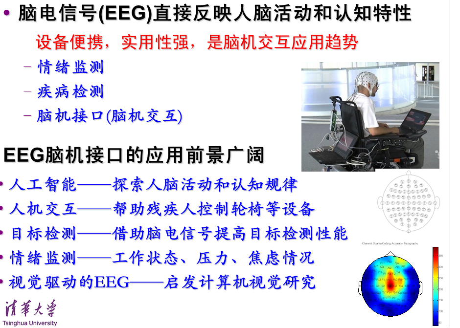 腦電信號(hào)(EEG)直接反映人腦活動(dòng)和認(rèn)知特性,可以做情緒的監(jiān)測、疾病的檢測、腦機(jī)的交互。在應(yīng)用領(lǐng)域和前景上是非常廣闊的,比如說在人工智能領(lǐng)域,它可以探索人腦活動(dòng)和認(rèn)知規(guī)律,在腦機(jī)交互上也可以幫助殘疾人來控制輪椅等設(shè)備,目標(biāo)檢測上可以借助腦電信號(hào)提高目標(biāo)檢測的性能。在情緒監(jiān)測上可以感知工作狀態(tài)、壓力和焦慮等等。另外就是在一些EEG研究上,利用EEG和對(duì)視覺的刺激上,可以研究人對(duì)視覺感知的特點(diǎn),來啟發(fā)視覺研究等等。應(yīng)用的前景非常好。