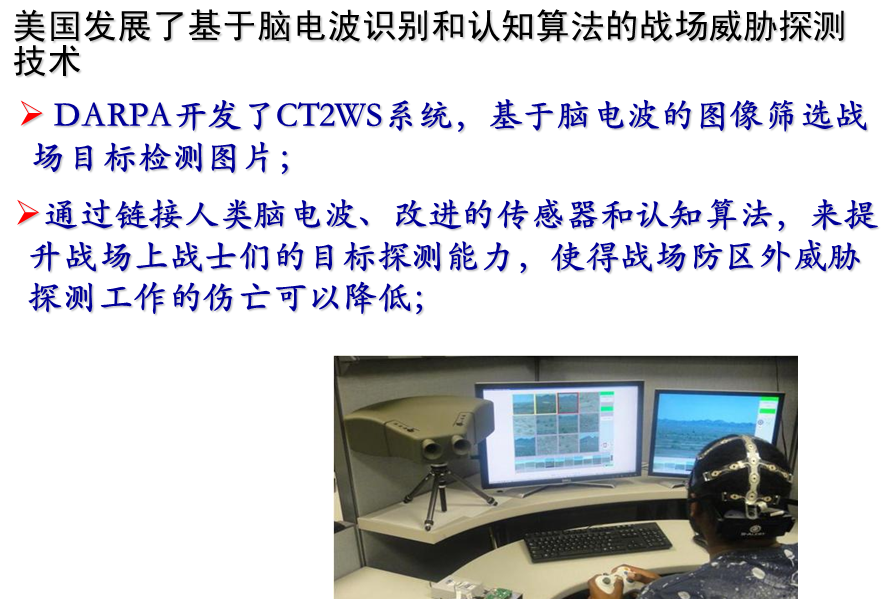 目前的一些研究的情況。這個(gè)方面國外走得比較快,美國在這方面處于領(lǐng)先地位。剛才我提到利用腦電信號(hào)做的目標(biāo)探測來提高目標(biāo)探測的性能。這個(gè)是DARPA開發(fā)的CT2WS系統(tǒng),是利用腦電波識(shí)別和認(rèn)知的范圍來進(jìn)行戰(zhàn)場目標(biāo)檢測,主要是通過腦電波的圖像篩選來把戰(zhàn)場的虛警目標(biāo)信號(hào)能夠快速地篩選掉。因?yàn)槲覀冎滥壳暗哪J阶R(shí)別,做圖像的目標(biāo)探測其實(shí)是虛警率非常高的,特別是在戰(zhàn)場環(huán)境非常惡劣,目標(biāo)并不明顯的情況下,任何一個(gè)算法,人工智能的算法或者是模式識(shí)別算法,拿到戰(zhàn)場,虛景都是非常高的,虛景高了以后,不可能每個(gè)虛景目標(biāo)都打一個(gè)炮彈,這個(gè)時(shí)候利用腦電的識(shí)別,這個(gè)腦電的識(shí)別其實(shí)用的就是P300范式,用非?斓乃俣劝烟摼靶盘(hào)讓人去看,人在無意識(shí)當(dāng)中就能產(chǎn)生一種腦電波,這種腦電波對(duì)于真正目標(biāo)信號(hào)和非目標(biāo)信號(hào)能夠產(chǎn)生一種有差別的信號(hào)模式。腦電識(shí)別可以通過這樣一種腦電波的差別來把這些虛景里面的真正目標(biāo)提取出來,把這些真正的虛景剔掉,這樣就提高了目標(biāo)識(shí)別的準(zhǔn)確率。給人看的速度是非常快的,在幾十毫秒,這時(shí)的腦電是人的一種本能的反應(yīng)。主要目的是提高戰(zhàn)場上戰(zhàn)士的目標(biāo)探測準(zhǔn)確率,這就是人機(jī)結(jié)合的方式。這個(gè)例子,是明尼蘇達(dá)大學(xué)研究,利用腦電波掃描系統(tǒng),網(wǎng)上也有相應(yīng)的視頻,有機(jī)會(huì)大家可以去網(wǎng)站上看一下這個(gè)視頻,控制得還是相當(dāng)不錯(cuò)的。