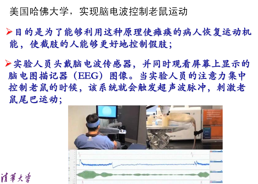 哈佛大學(xué)實(shí)現(xiàn)了利用腦電波控制老鼠的運(yùn)動(dòng)。其實(shí)希望能夠利用這樣一種原理,實(shí)驗(yàn)人員在老鼠上做的實(shí)驗(yàn),是希望通過這樣一種方式使他們的病人恢復(fù)運(yùn)動(dòng)的機(jī)能,使截肢的人能夠更好控制假肢,也是帶著這樣一個(gè)傳感器,但是這個(gè)傳感器是非常小型化的傳感器,所以非常實(shí)用。另外還有一個(gè)就是美國科羅拉多州的一個(gè)人(Easton LaChappelle)開發(fā)了腦電波控制的機(jī)械手臂(Anthromod)。它的目的也是幫助殘疾人士能夠完成最基本的動(dòng)作,這個(gè)人不僅獲得了國際科學(xué)工程大賽的二等獎(jiǎng),更是收到了NASA的Offer,也受到了美國奧巴馬總統(tǒng)的接見。這是國際的情況。我們國內(nèi)也有很多成果。
