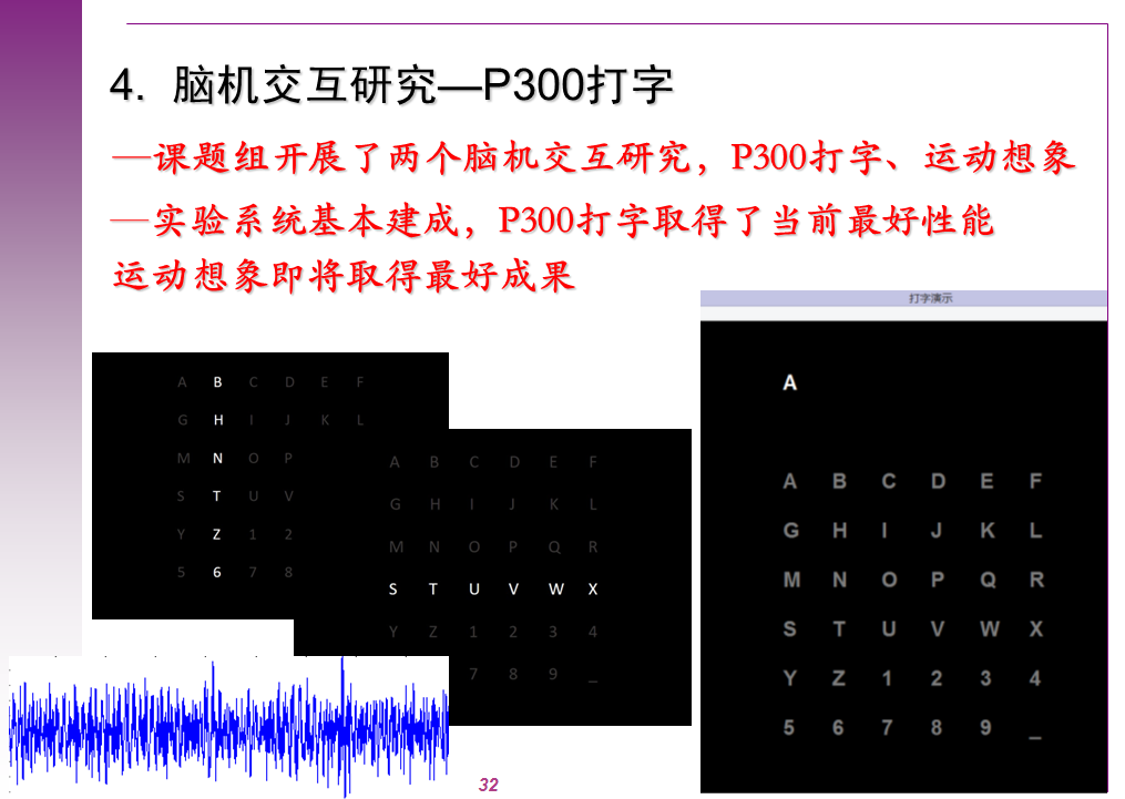 2、面向多種范式的思維腦控技術(shù)。重點(diǎn)研究就是VEP,現(xiàn)在一個(gè)比較有效的就是SSVEP,這是清華生醫(yī)提出來的。還有運(yùn)動(dòng)想象腦控技術(shù)和方法,以及更多的范式的研究,希望能夠發(fā)現(xiàn)。