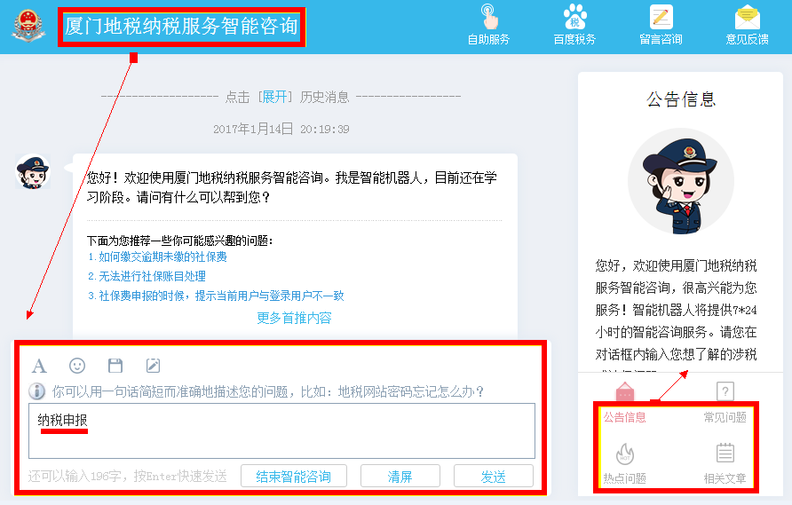 捷通華聲為廈門地稅部署的靈云智能客服系統(tǒng),面向納稅人提供7*24小時(shí)的實(shí)時(shí)在線咨詢服務(wù)。納稅人可通過文字、表情等方式輸入自己的問題(或選擇推薦問題),還可以查看最新的公告信息、常見問題、熱點(diǎn)問題、相關(guān)文章等,全面了解涉稅業(yè)務(wù)。