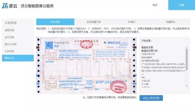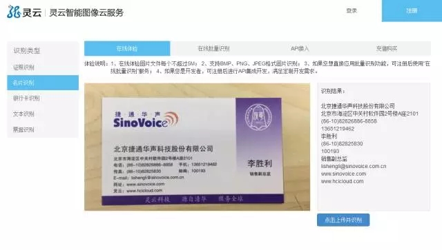 如果您想使用名片識別服務(wù),但又不想開發(fā)產(chǎn)品,您可直接訪問靈云圖像云(ocr.aicloud.com),進行名片的在線批量識別。