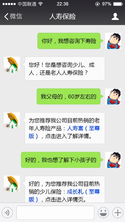 為便于客戶了解、選擇保險產(chǎn)品,智能客服提供文字回答、產(chǎn)品圖文簡介、業(yè)務(wù)鏈接跳轉(zhuǎn)以及音視頻播放等適用于網(wǎng)站、APP、微信等不同渠道的內(nèi)容形式,并與保險企業(yè)業(yè)務(wù)系統(tǒng)全面對接,讓客戶可以通過智能客服方便地自助辦理保險咨詢、購買、理賠等業(yè)務(wù)。