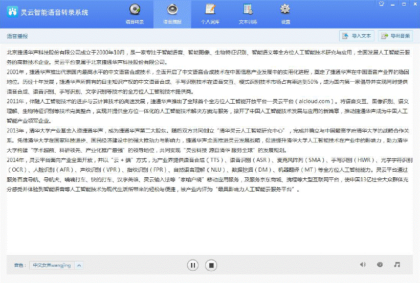 在提供語音識別的同時,靈云智能語音轉錄系統(tǒng)為會議主持者提供語音合成服務,通過輸入文字,選擇男聲、女聲等不同的音色,完成廣播音頻合成。