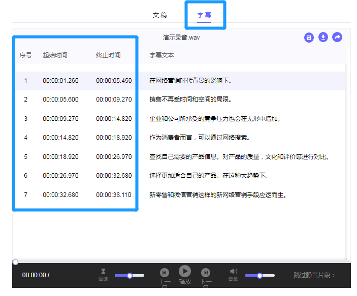 【靈云聽語】Web版的編輯功能則更為豐富。在基礎的回聽編輯功能基礎上,還能自動生成“摘要”,快速摘取重點內(nèi)容。強大的字幕格式編輯清晰展現(xiàn)每一句文本的起始與終止時間。