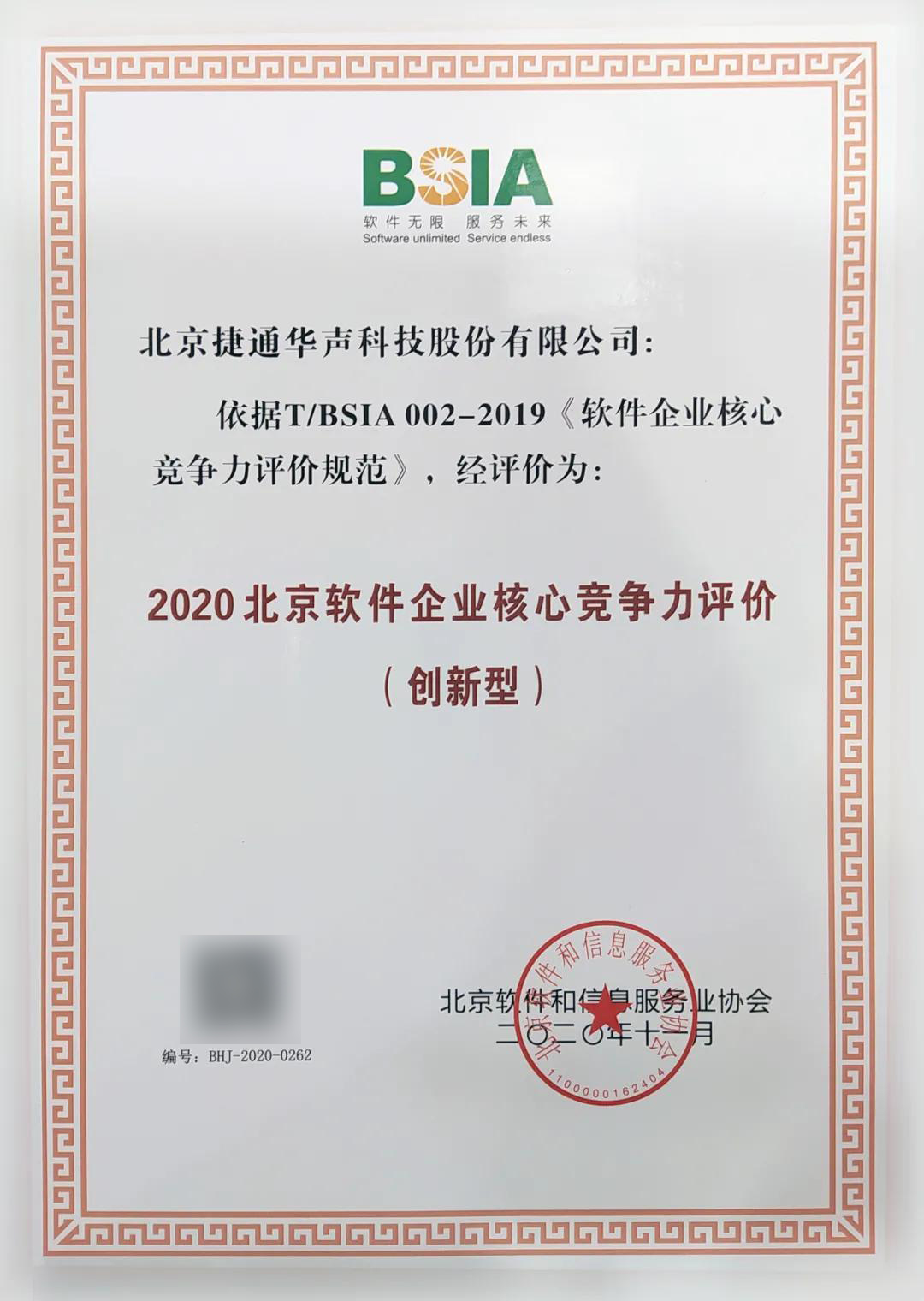 捷通華聲榮獲《2020北京市軟件企業(yè)核心競爭力評價(創(chuàng)新型)》