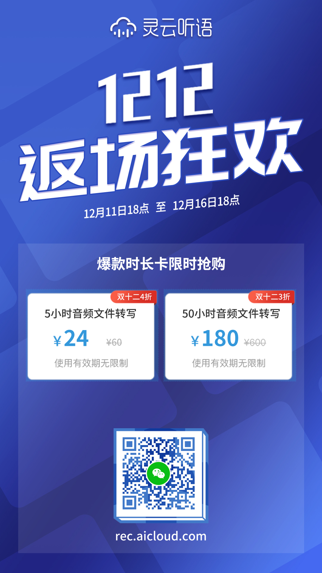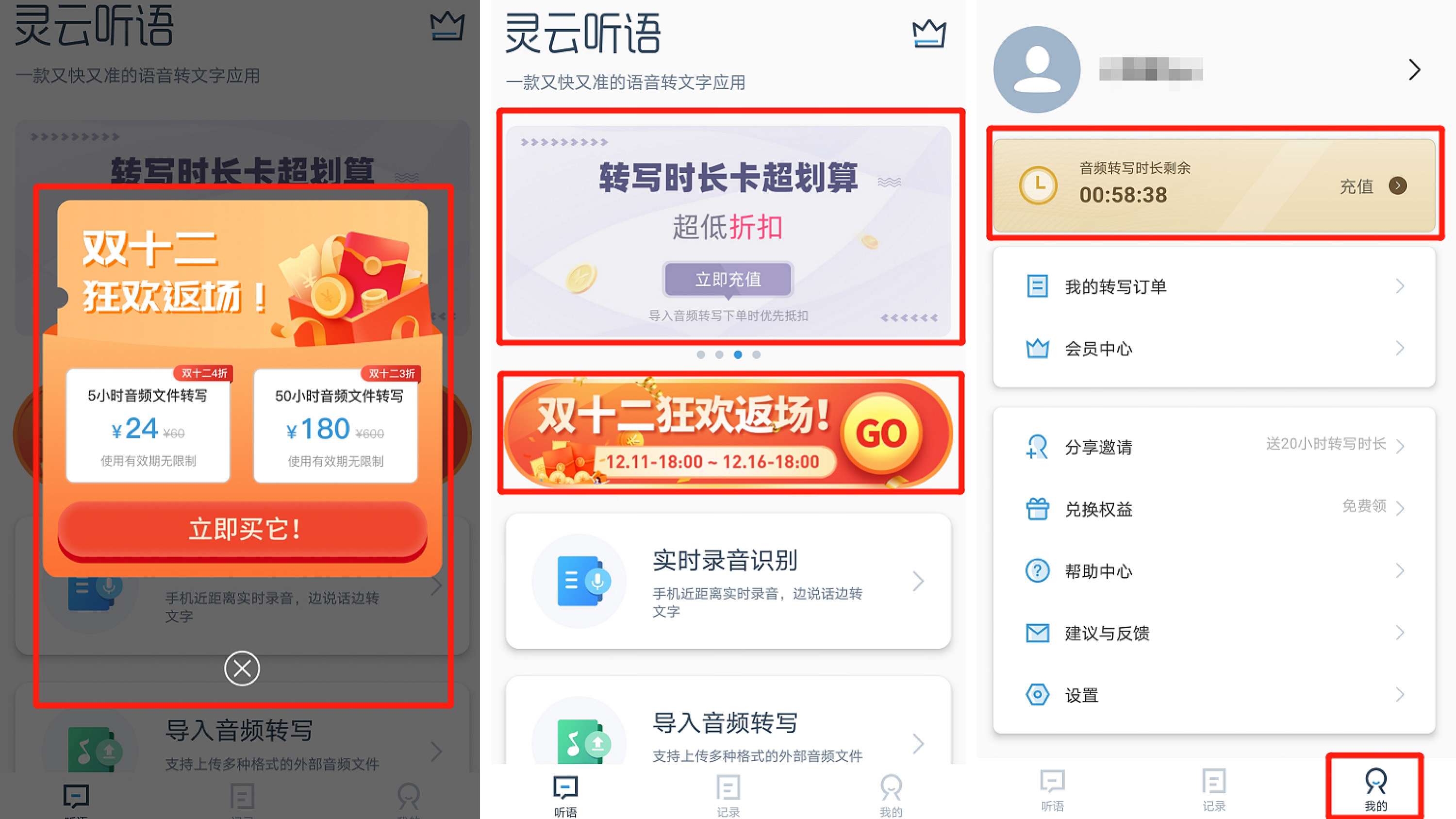 也可以通過點(diǎn)擊靈云聽語安卓版“首頁”的彈窗、廣告位圖片、第三張Banner圖片和“我的”音頻轉(zhuǎn)寫時(shí)長充值,進(jìn)行低價(jià)時(shí)長卡購買!