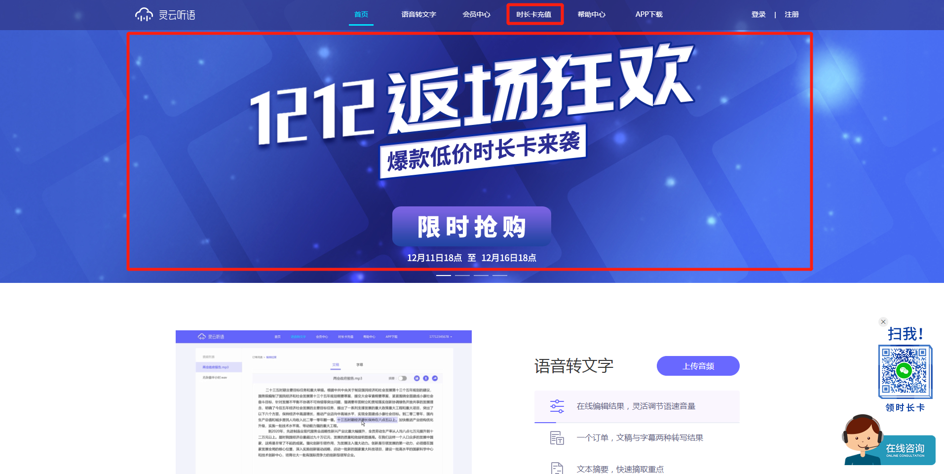 用戶可通過登錄靈云聽語官網(wǎng)(rec.aicloud.com),點(diǎn)擊首張Banner圖片,或導(dǎo)航欄“時(shí)長卡充值”按鈕,快速進(jìn)入時(shí)長卡購買界面進(jìn)行購買!