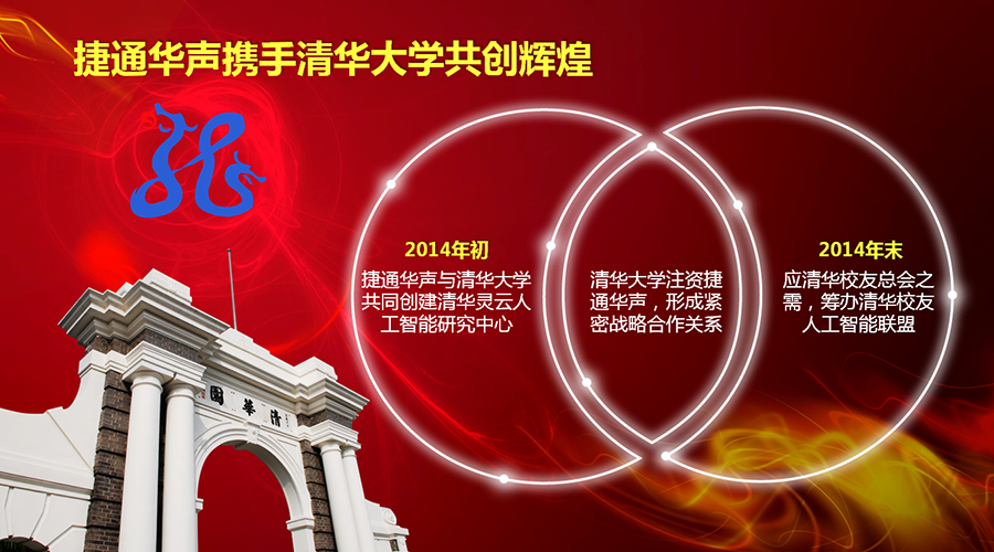 2014年末,鑒于捷通華聲公司與清華大學的深入合作在廣大清華校友中得到了廣泛的好評。清華校友總會邀請捷通華聲推動成立“清華校友總會人工智能聯(lián)盟”,旨在發(fā)揮清華大學在人工智能領域的科研優(yōu)勢,合清華之力,率先打造一個清華校友在人工智能領域的“產(chǎn)學研”聯(lián)盟,融合產(chǎn)業(yè)力量,共同構建健康繁榮的人工智能產(chǎn)業(yè)生態(tài)圈,推動整個中國人工智能產(chǎn)業(yè)的長足發(fā)展。