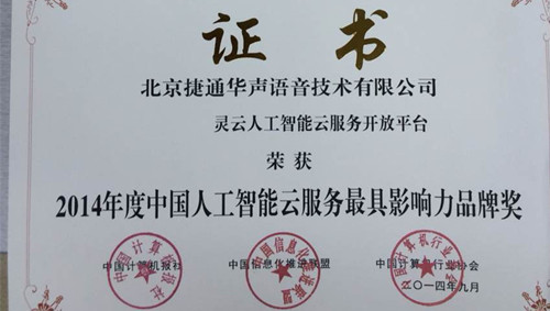 2014年9月19日,靈云全方位人工智能開放平臺在“第六屆中國行業(yè)信息化獎項評選活動”上,憑借其全方位的智能人機交互能力和廣大用戶的高度認可榮獲“2014年度中國人工智能云服務(wù)最具影響力品牌獎”。