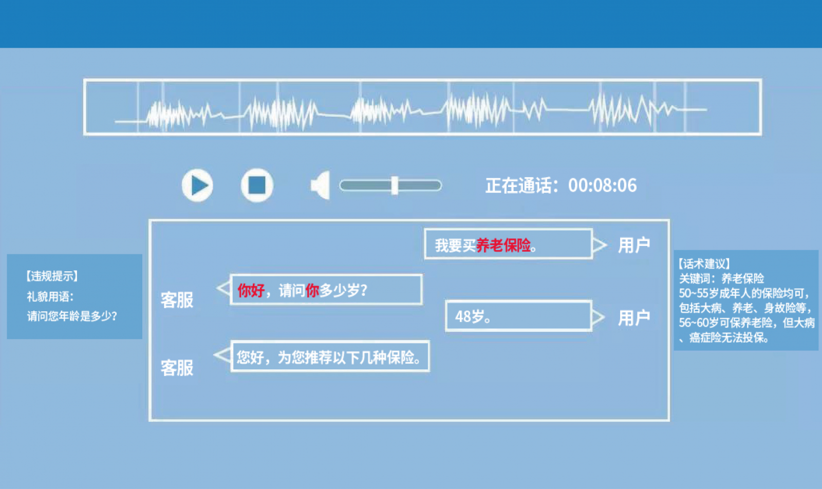 另外,智能坐席助手,一方面將坐席與客戶的通話實(shí)時(shí)轉(zhuǎn)寫為文字,當(dāng)坐席服務(wù)時(shí),出現(xiàn)禮貌用語缺失、禁忌語或情緒失控等異常情況,系統(tǒng)給予實(shí)時(shí)提醒,必要時(shí)班組長干預(yù)、接管通話;另一方面,坐席外呼營銷時(shí),為坐席提供實(shí)時(shí)話術(shù)輔助,及時(shí)提醒坐席業(yè)務(wù)知識(shí)、產(chǎn)品功能特點(diǎn)、挽留話術(shù)等,幫助坐席提升外呼營銷成單率。