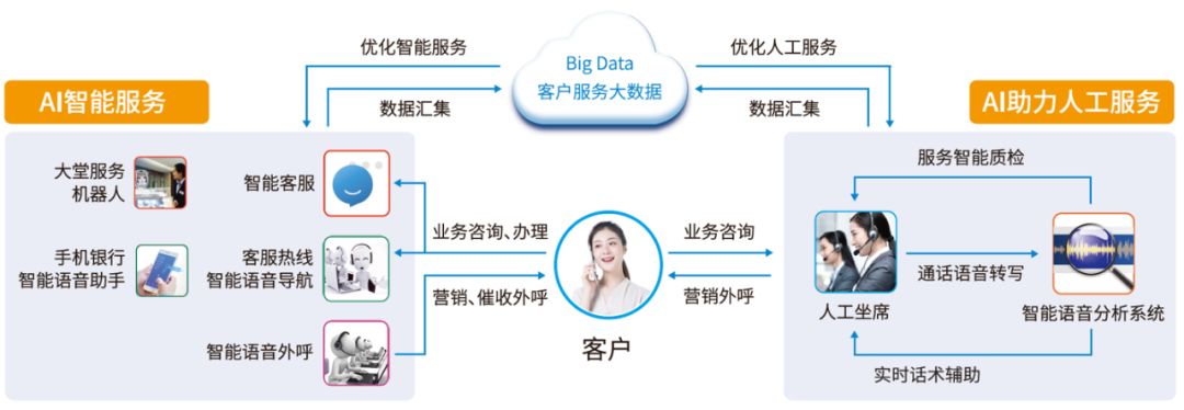 ● 智能客戶服務(wù):智能客服、智能語(yǔ)音導(dǎo)航在微信、網(wǎng)頁(yè)、APP、電話等多種渠道, 為用戶解答咨詢、辦理業(yè)務(wù)