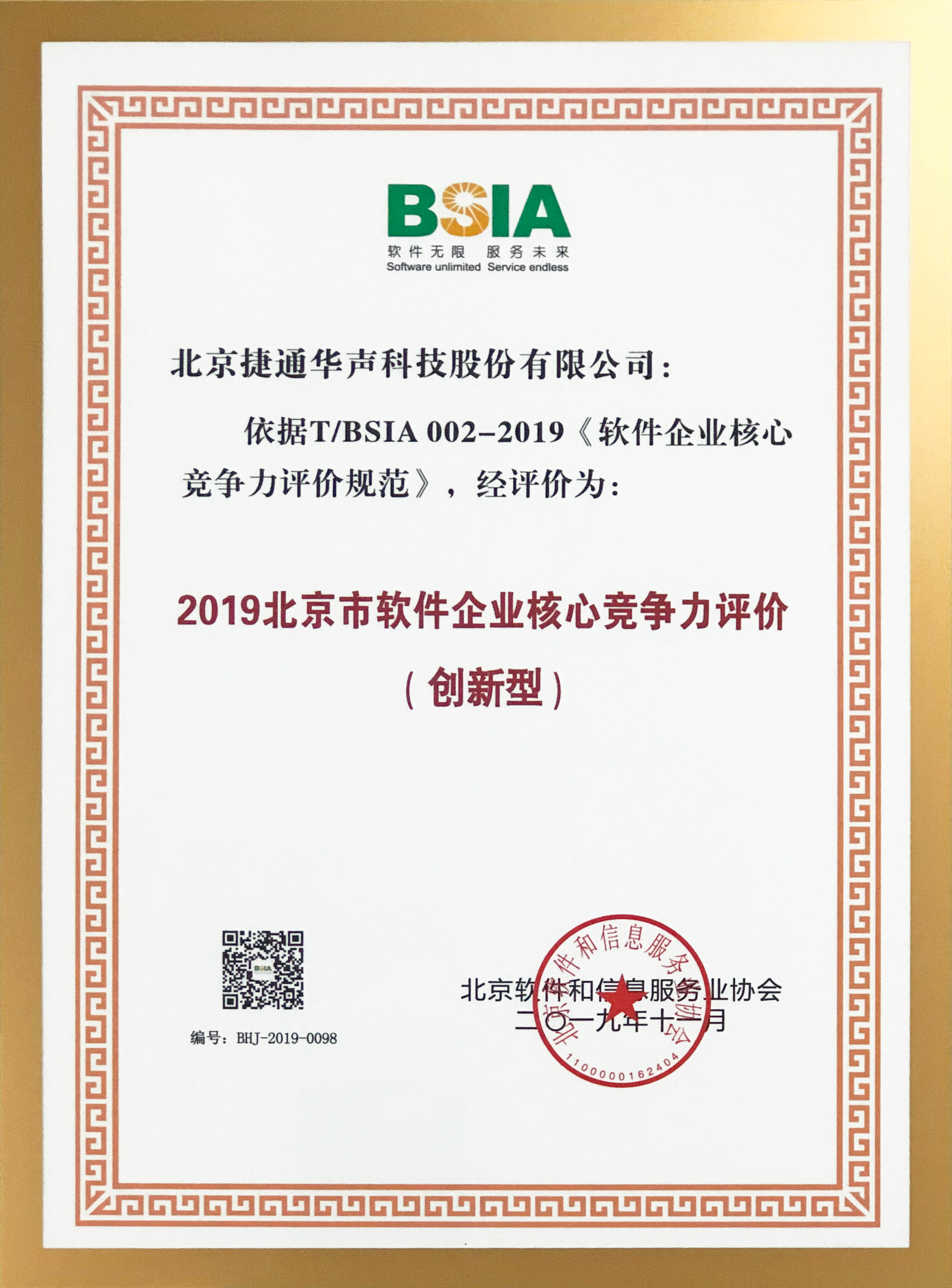 捷通華聲榮獲《2019北京市軟件企業(yè)(創(chuàng)新型)核心競(jìng)爭(zhēng)力評(píng)價(jià)》