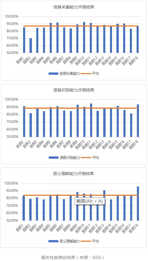 本輪評測系統(tǒng)測試了語音識別、語義理解、結(jié)果分析等6項服務(wù)性能指標(biāo)。下圖給出了信息采集能力、統(tǒng)計分析能力、語音識別能力和語義理解能力等多個重要性能指標(biāo)的準(zhǔn)確率。(圖中系統(tǒng)與上表序號無對應(yīng)關(guān)系)