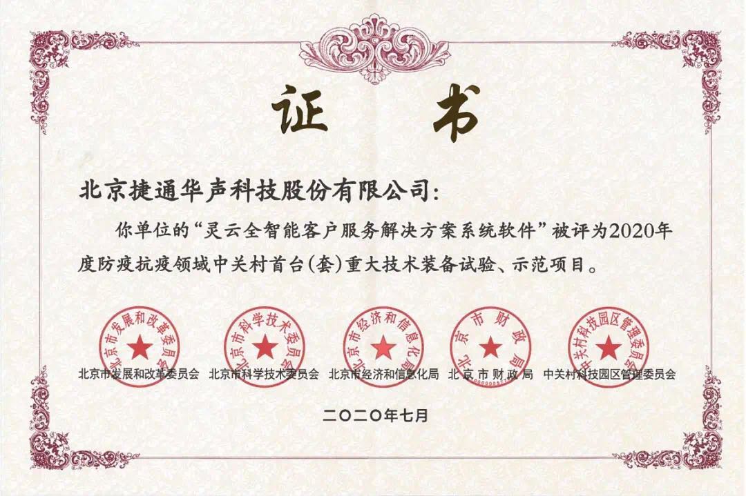 在中關(guān)村管委會、北京市發(fā)改委、北京市科委、北京市經(jīng)信局、北京市財政局組織開展的2020年度防疫抗疫領(lǐng)域中關(guān)村首臺(套)重大技術(shù)裝備試驗(yàn)、示范項(xiàng)目工作中,捷通華聲“靈云全智能客戶服務(wù)解決方案系統(tǒng)軟件”項(xiàng)目憑借在抗擊新冠肺炎疫情期間作出突出貢獻(xiàn)獲得認(rèn)定。