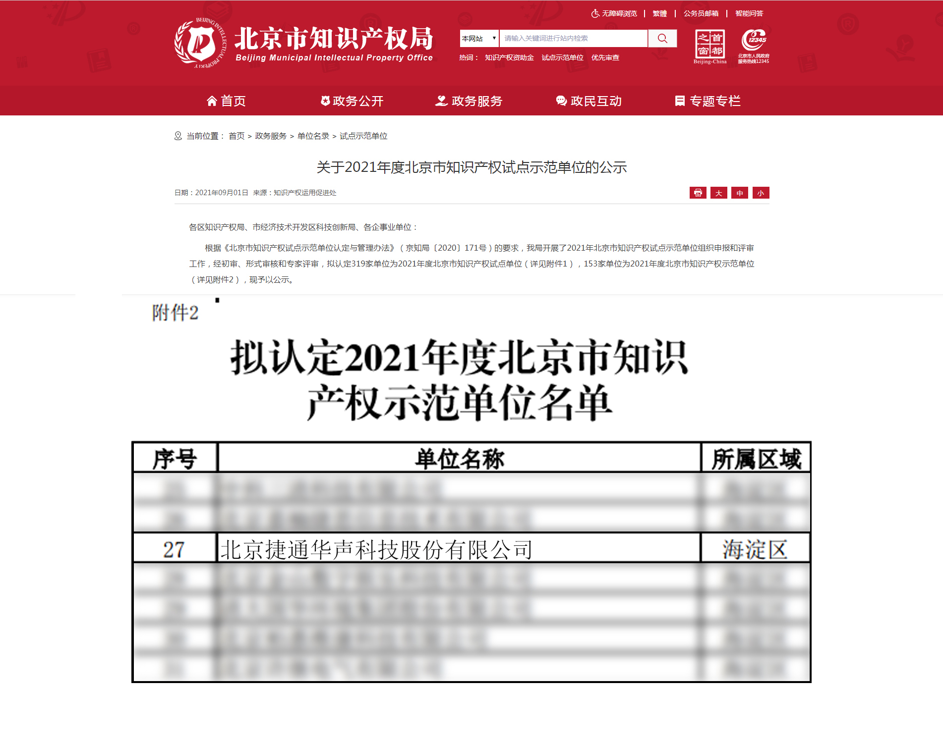 近日,北京市知識產(chǎn)權(quán)局發(fā)布了“2021年度北京市知識產(chǎn)權(quán)試點示范單位”名單。捷通華聲憑借核心技術(shù)研發(fā)實力和知識產(chǎn)權(quán)保護與應(yīng)用方面的突出表現(xiàn),榮獲“2021年北京市知識產(chǎn)權(quán)示范單位”。