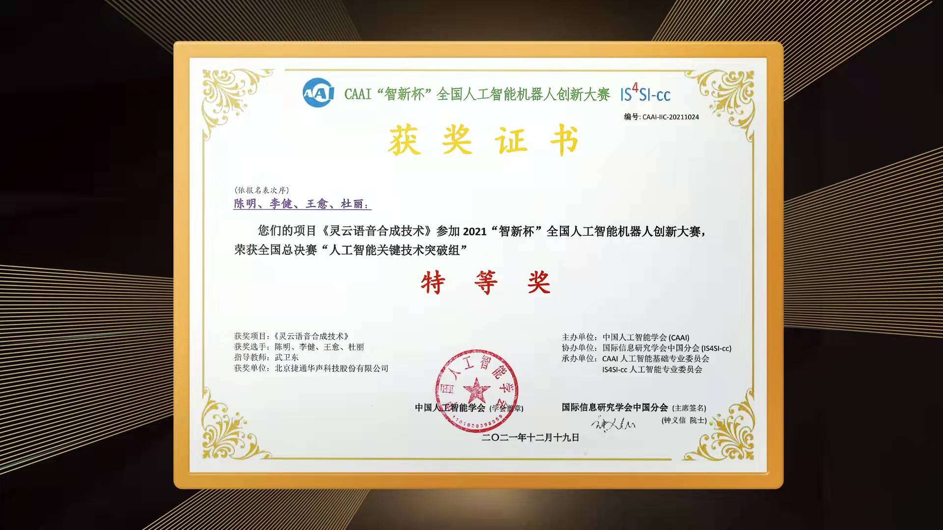 近日,由中國人工智能學會主辦,CAAI人工智能基礎(chǔ)專業(yè)委員會和國際信息研究學會中國分會人工智能專業(yè)委員會聯(lián)合承辦的2021“智新杯”全國人工智能機器人創(chuàng)新大賽總決賽頒獎典禮暨人工智能基礎(chǔ)理論創(chuàng)新論壇在北京成功舉辦。捷通華聲憑借在語音合成領(lǐng)域的創(chuàng)新技術(shù)優(yōu)勢成功榮獲全國總決賽“人工智能關(guān)鍵技術(shù)突破組”特等獎。