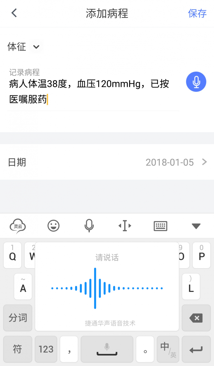 為了提高醫(yī)生書寫電子病歷的效率,捷通華聲面向醫(yī)院推出靈云智聲(醫(yī)療版),包含PC語音輸入法和安卓語音輸入法,為醫(yī)生病歷書寫、護士查房記錄提供高效的信息錄入工具,已成功服務(wù)天津、北京等省市多家知名醫(yī)院。
