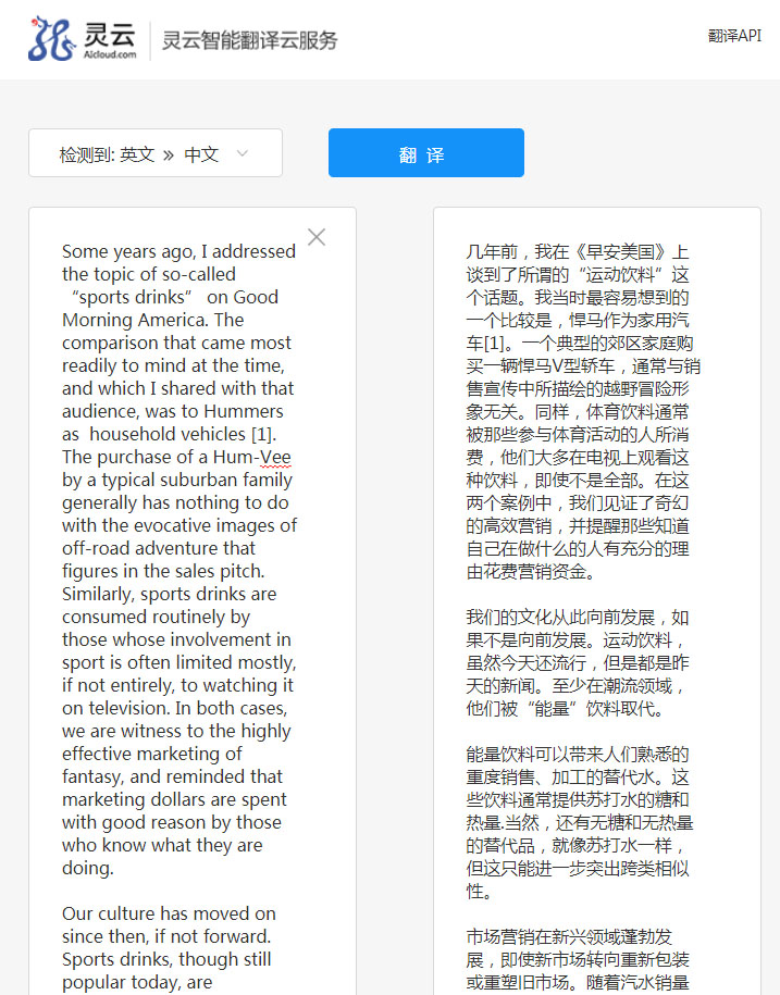 靈云翻譯云支持篇章級翻譯。用戶只需將需要翻譯的內(nèi)容整體粘貼進(jìn)來,系統(tǒng)就能自動(dòng)檢測,然后進(jìn)行翻譯。翻譯的結(jié)果可一鍵復(fù)制,快速摘錄,讓外文文獻(xiàn)閱讀更容易。