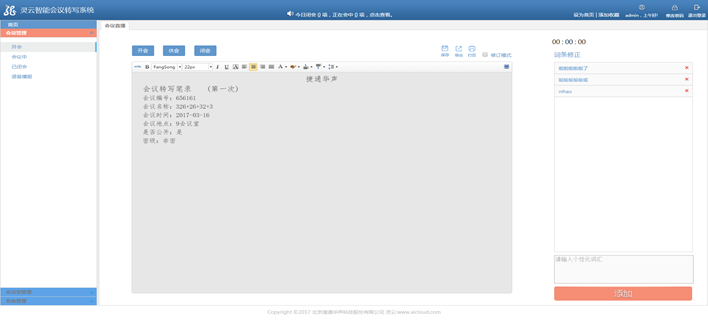 靈云智會(huì)系統(tǒng)是捷通華聲專為“智能會(huì)議”應(yīng)用場(chǎng)景推出的一整套獨(dú)立系統(tǒng)。通過融合語音識(shí)別、語音合成等人工智能技術(shù),快速將會(huì)議發(fā)言轉(zhuǎn)寫成文字,成為政府會(huì)議、司法辦案的得力助手。