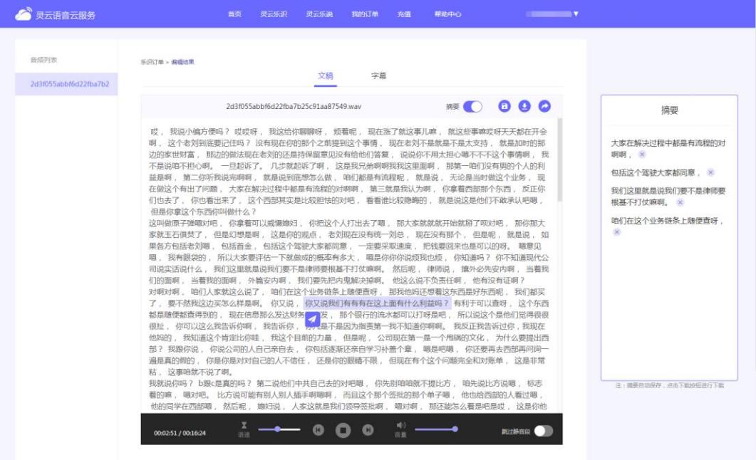 對于大段音頻轉(zhuǎn)寫,可快速在結(jié)果中提取重要句子作為音頻摘要,且內(nèi)容可隨時修改。