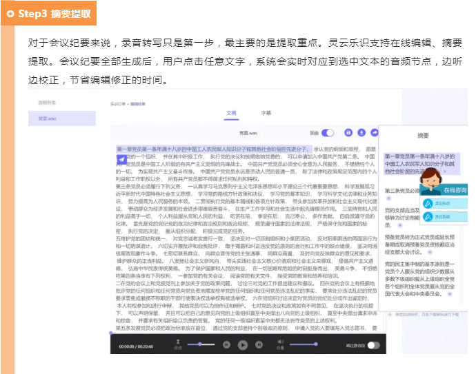 少了面對面交流,要確保會議內(nèi)容及時同步,便于進度追蹤,會議紀要必不可少。登陸靈云語音云(speech.aicloud.com),即可直接將會議音頻文件轉(zhuǎn)成文字,遠勝于人工打字。
