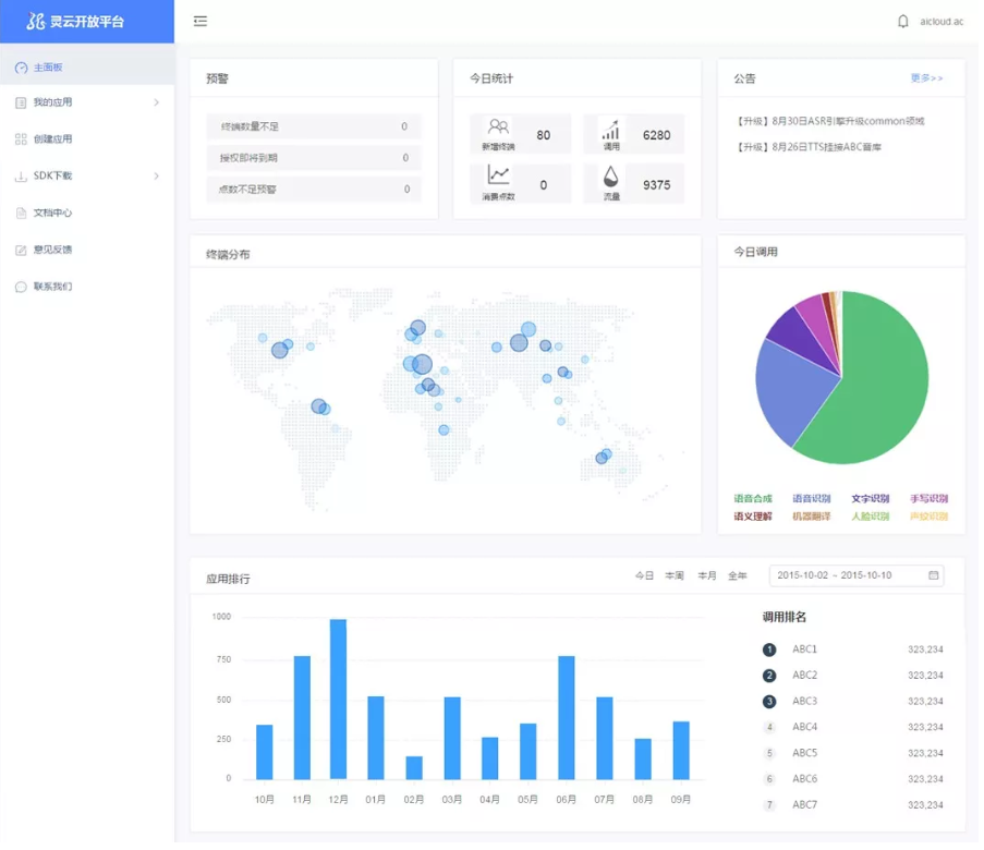 開發(fā)者登陸到開放平臺之后,可以在主面板查看賬號內(nèi)應(yīng)用整體的信息,包括:應(yīng)用預(yù)警、今日統(tǒng)計、公告、終端分布統(tǒng)計、今日調(diào)用比例、應(yīng)用排行等,實現(xiàn)基本信息全面了解。