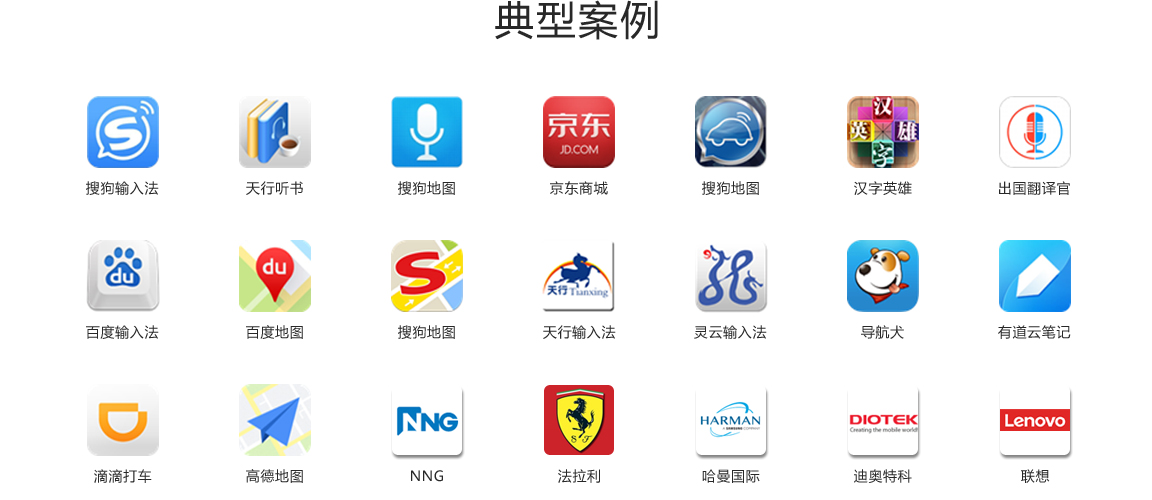 自2011年全面開放以來,靈云平臺各項人工智能技術(shù)先后成功服務(wù)智能應(yīng)用、智能家電、智能車載、智能音箱、智能機器人等眾多領(lǐng)域客戶,在京東商城、出國翻譯官、高德地圖、快快查字典等上萬個APP中得以應(yīng)用,也為小米電視、PPTV、廣電機頂盒等眾多電視、機頂盒廠商提供了語音交互服務(wù),終端用戶量超6億。聯(lián)想集團、中國民族語文翻譯局等諸多老牌企事業(yè)單位,哈曼、法拉利、NNG、Diotek等優(yōu)秀國際公司均與靈云平臺合作,構(gòu)建智能化應(yīng)用服務(wù)。