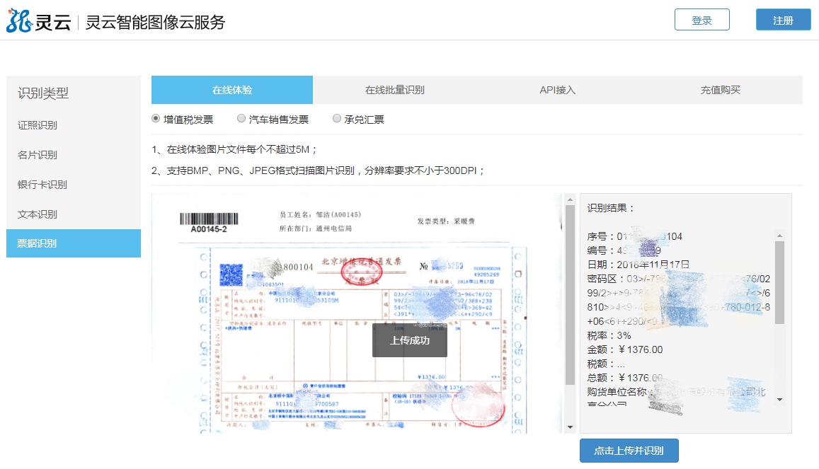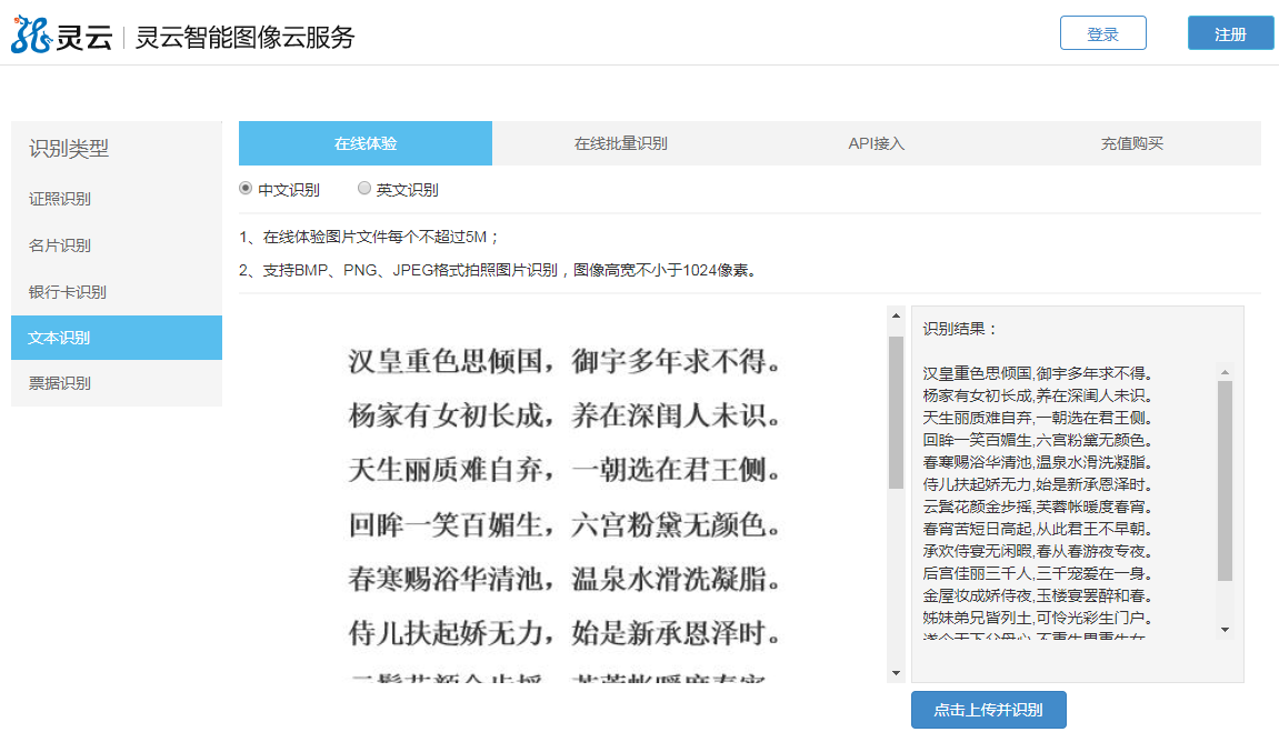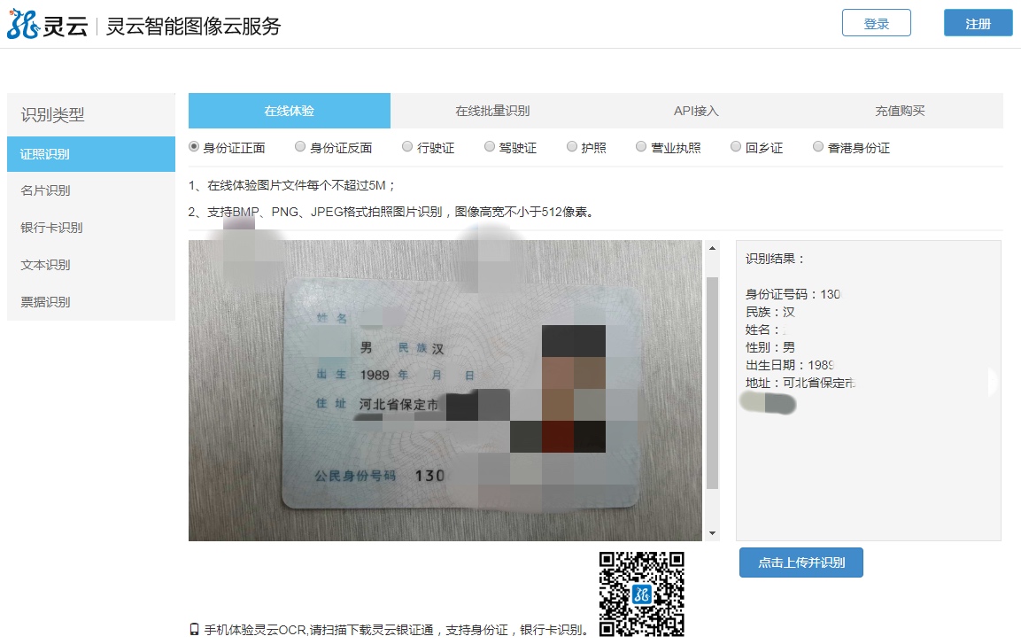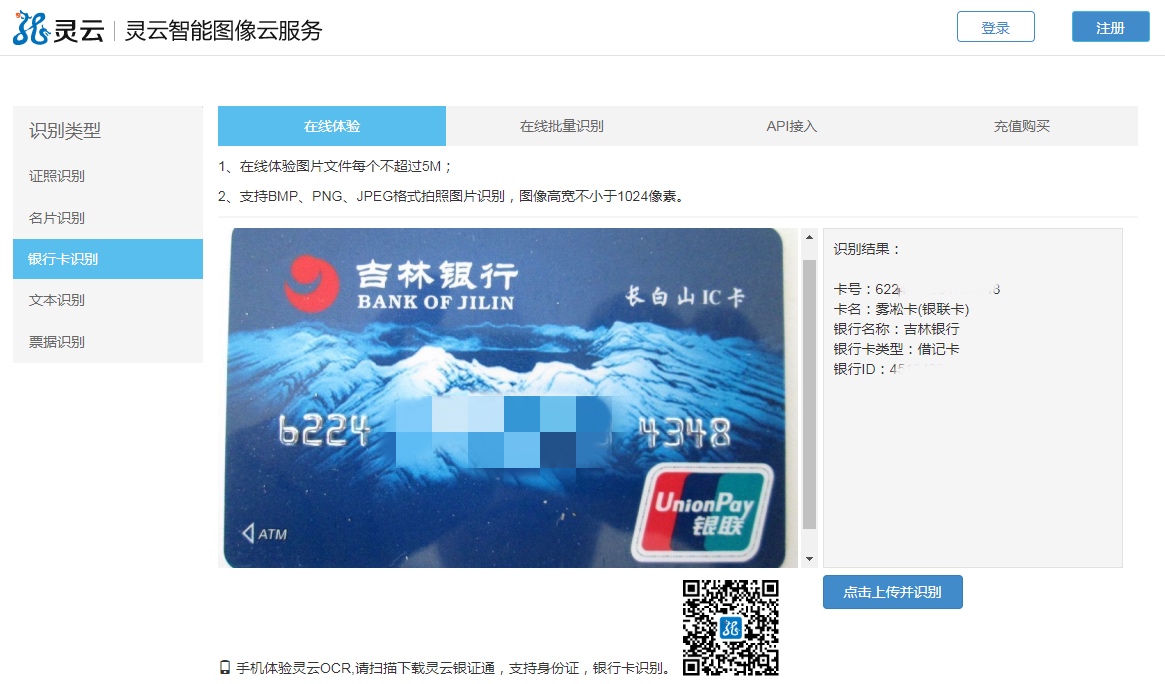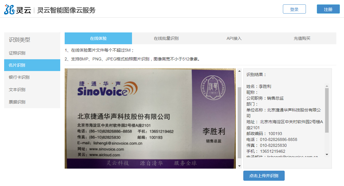 靈云智能圖像云服務目前為廣大用戶提供證照識別、名片識別、銀行卡識別、文本識別和票據(jù)識別等五大類識別服務。