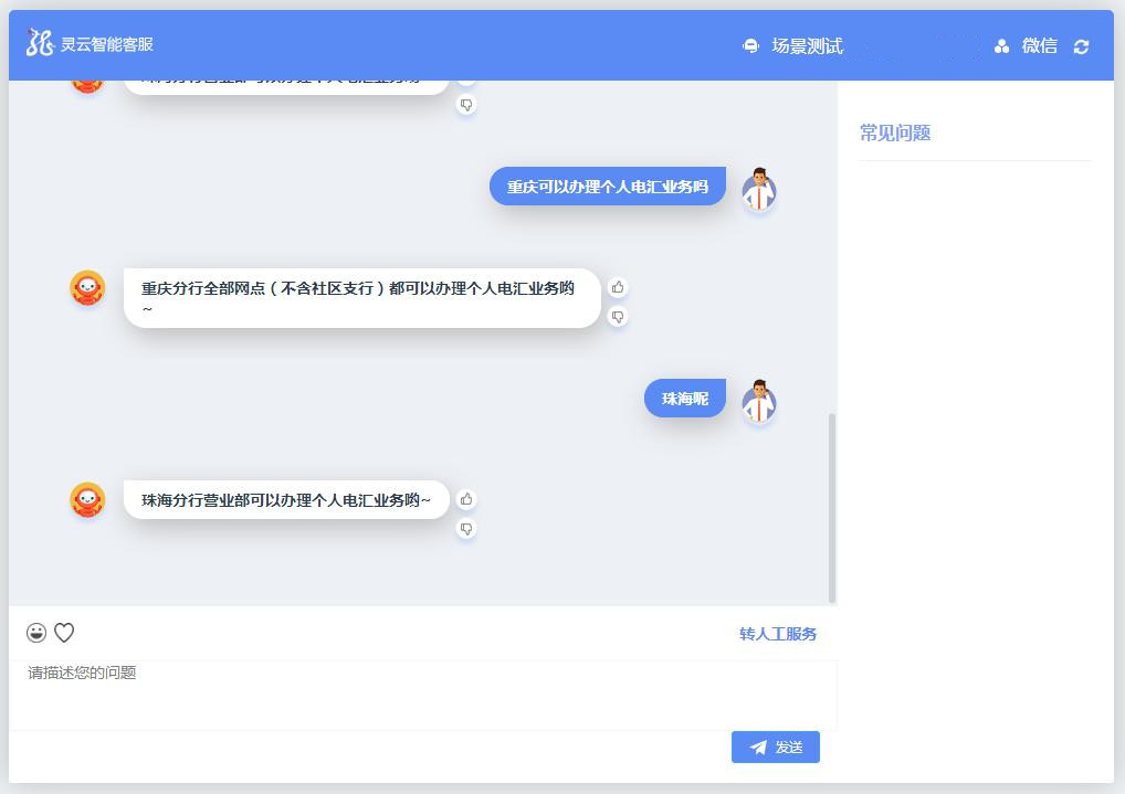 舉例來講,比如我說“重慶可以辦理個(gè)人電匯業(yè)務(wù)嗎”,機(jī)器人給出回答,然后追問“珠海呢”,機(jī)器人也可以直接給出答案。如下圖: