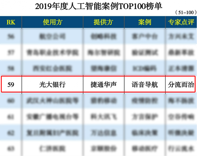 2020年4月,由中國(guó)科學(xué)院《互聯(lián)網(wǎng)周刊》、eNet研究院評(píng)選的“2019年度人工智能案例TOP100”發(fā)布,捷通華聲為光大銀行構(gòu)建的靈云智能語(yǔ)音導(dǎo)航系統(tǒng)憑借在服務(wù)用戶過(guò)程中的出色表現(xiàn),成功上榜。