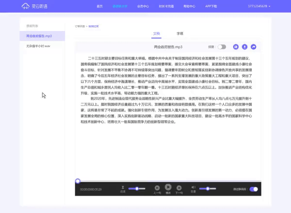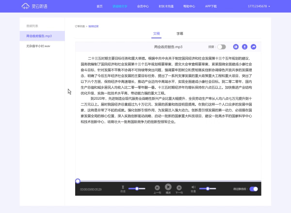 無論是靈云聽語Web版還是App版都支持在線回聽編輯,點(diǎn)擊生成的文字自動播放對應(yīng)原音,方便用戶邊聽邊核對、修改文字,甚至在編輯界面直接成文。