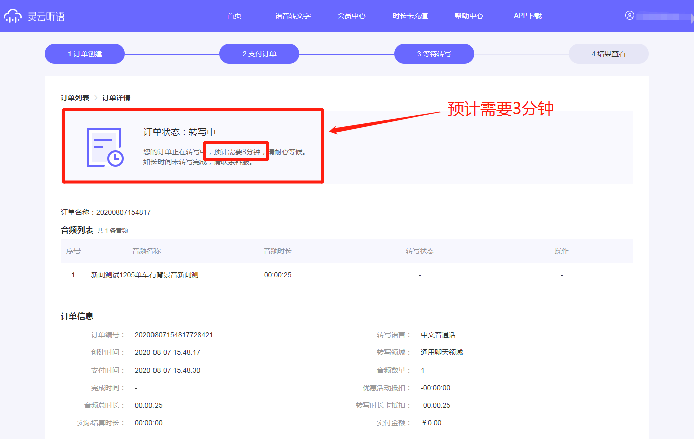 很多用戶在上傳音頻、提交訂單之后,最關(guān)心的問題就是“多久能轉(zhuǎn)好?” 沒錯,等待從來都是最難熬的過程。靈云聽語為了讓大家心里有底,會根據(jù)音頻時長、平臺負(fù)荷情況等信息自動計(jì)算、評估訂單完成時間。如此,用戶不必頻繁查看轉(zhuǎn)寫是否完成,等待期間可以安心做其他事情,到時間查看結(jié)果即可。