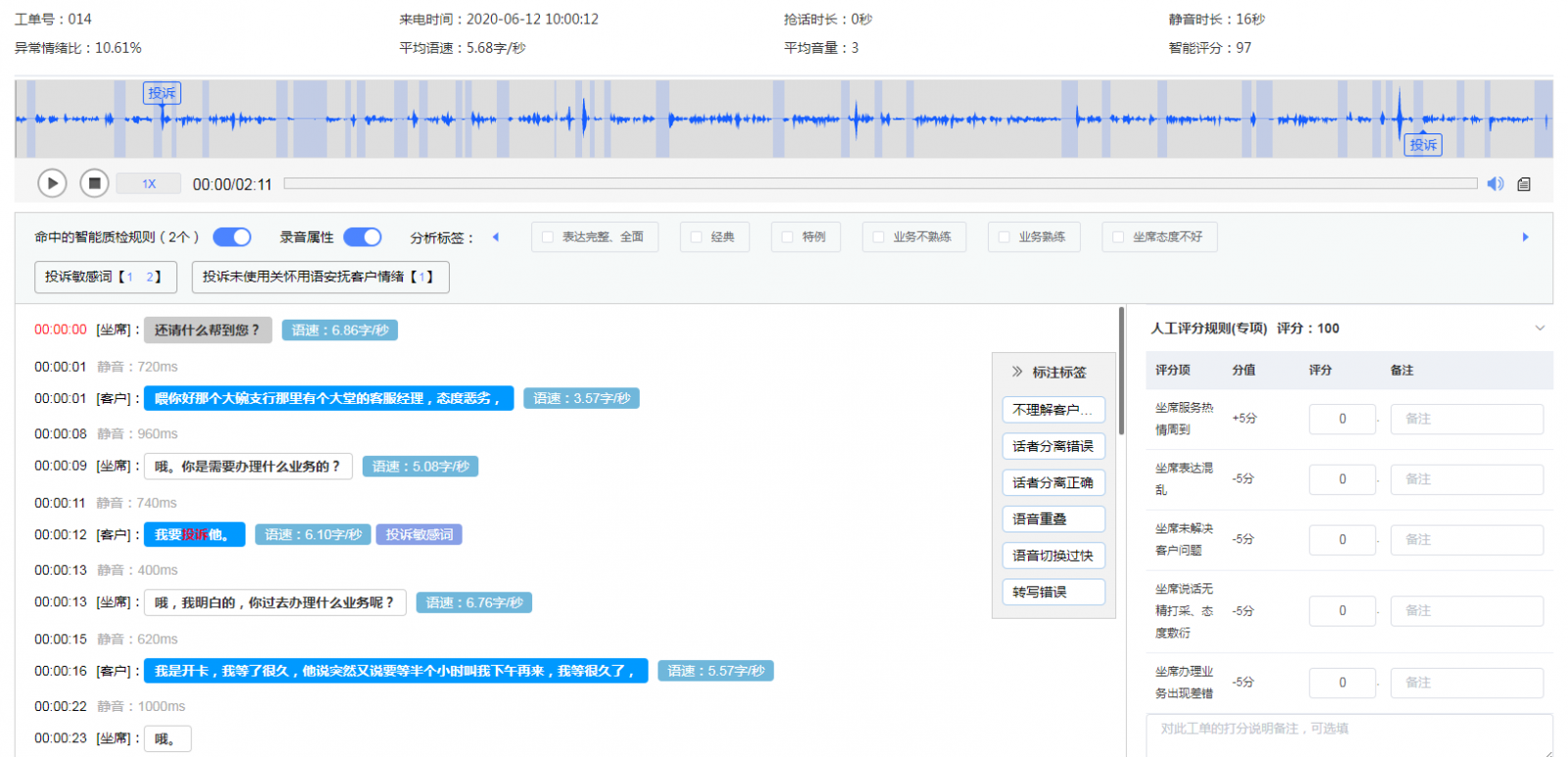 語(yǔ)音識(shí)別、語(yǔ)義理解、自然語(yǔ)言處理、大數(shù)據(jù)分析等人工智能技術(shù)的快速發(fā)展,能夠輕松將通話錄音精準(zhǔn)地轉(zhuǎn)為文字,分析通話內(nèi)容,并根據(jù)既定評(píng)審規(guī)則進(jìn)行評(píng)分,發(fā)現(xiàn)并標(biāo)注客服工作中存在的問題。