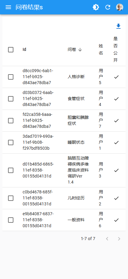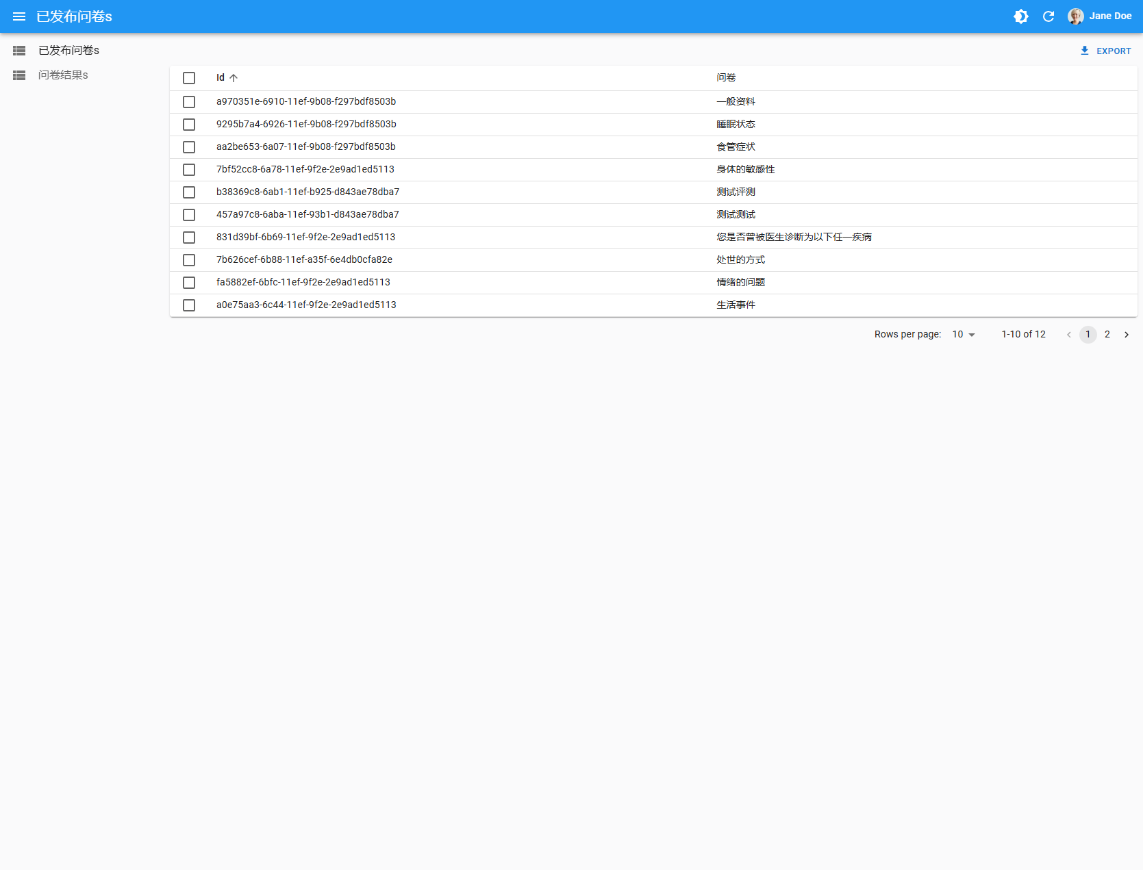 1. 已發(fā)布量表頁面:展示所有已上線量表,包含量表ID、名稱及其他基本信息。支持導出功能,便于批量管理。