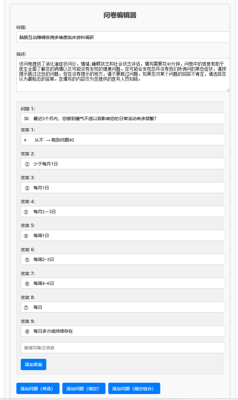3. 量表編輯器:提供全流程的量表生成工具,包括題目描述、答案配置與跳轉(zhuǎn)邏輯設置等功能,操作簡潔直觀。